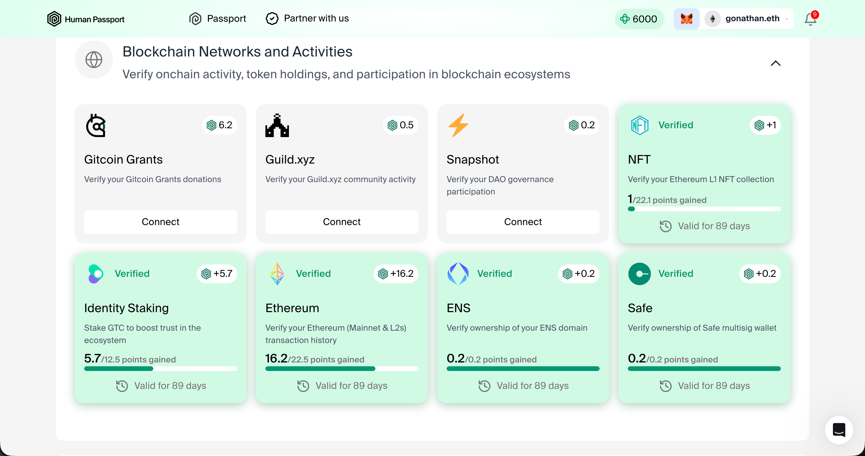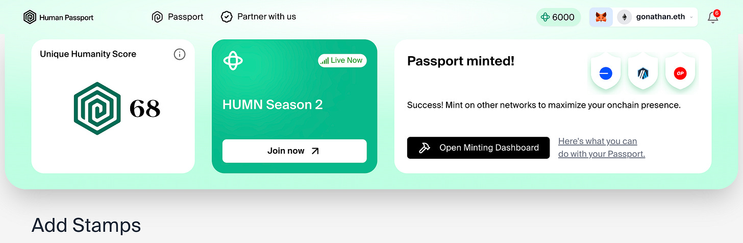 既然如此,有沒有一項區塊鏈應用能在不揭露個資的前提下賦予人格證明呢?Human Passport 是候選工具之一。嚴格說起來,Human Passport 並非直接賦予人格證明,而是透過「Unique Humanity Score」的評分機制,判別特定地址是否為真人使用者。分數越高,代表該地址越有機會通過各項區塊鏈專案訂定的真人檢測門檻。