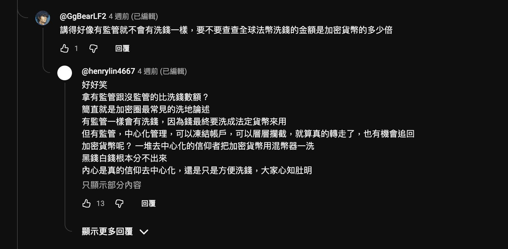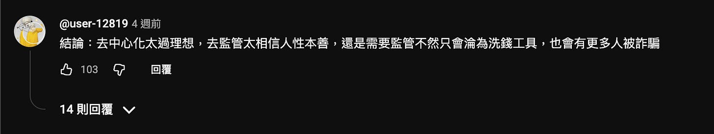 該說不愧是大眾型 YT 頻道嗎,留言區的各種言論也是非常主流,看看大眾簡簡單單地就將詐騙案件歸因於區塊鏈的監管不足,講得好像有監管就不會有洗錢一樣。