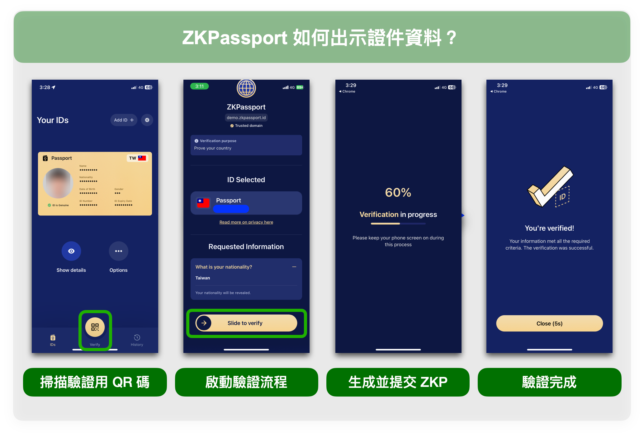以出示國籍的場景為例,使用者只需透過 ZKPassport 掃描並啟動驗證流程,接著手動確認,即可完成國籍認證。