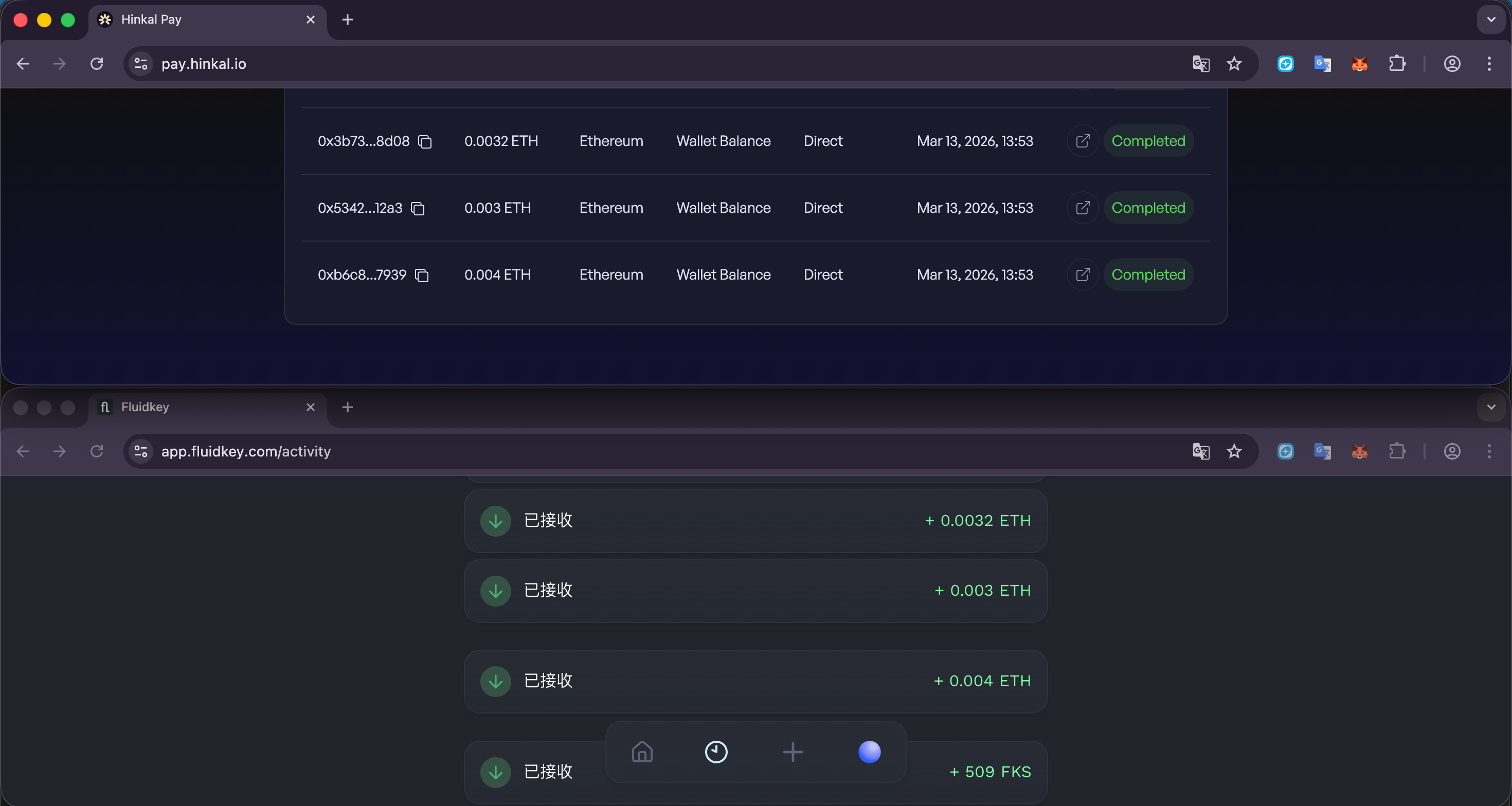 於是乎,下圖就是我利用 Hinkal Pay,把一筆交易中的以太幣分別發送給 3 個 Fluidkey 地址。