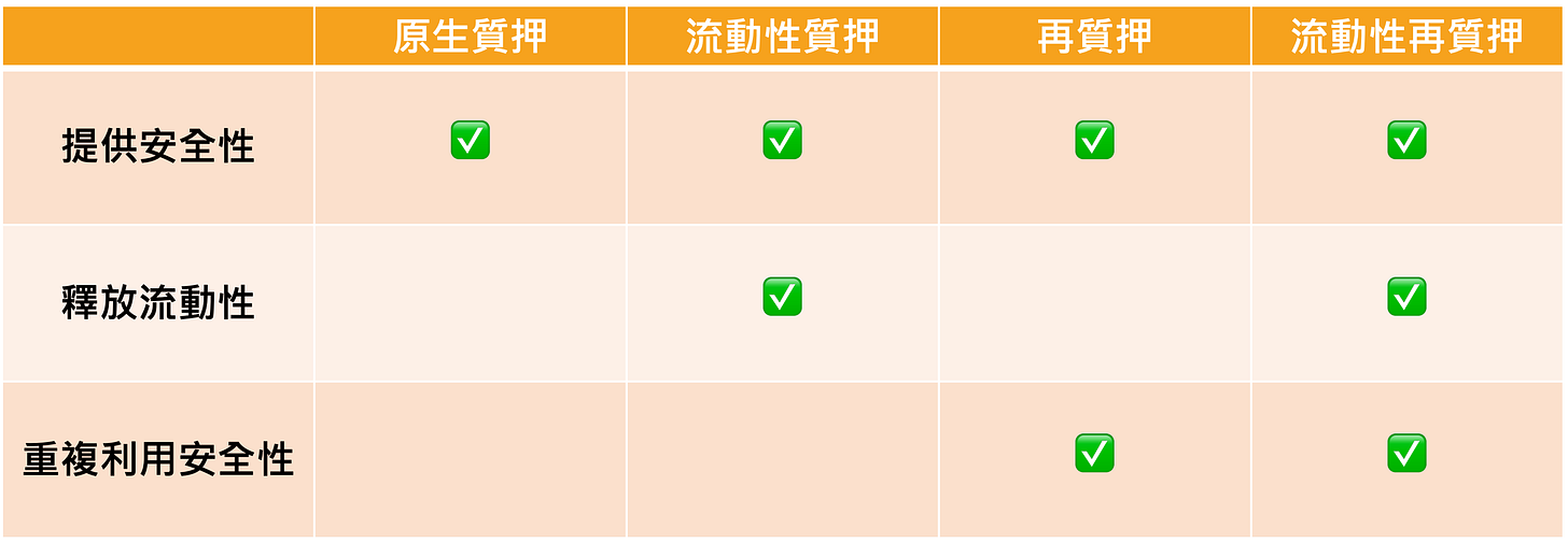 至此,質押的四種應用也差不多介紹完了,先感謝你讀到這邊🙏 若仍對以上概念抱有疑惑,我整理了一項表格,能幫助你簡單看懂四種質押的特性: