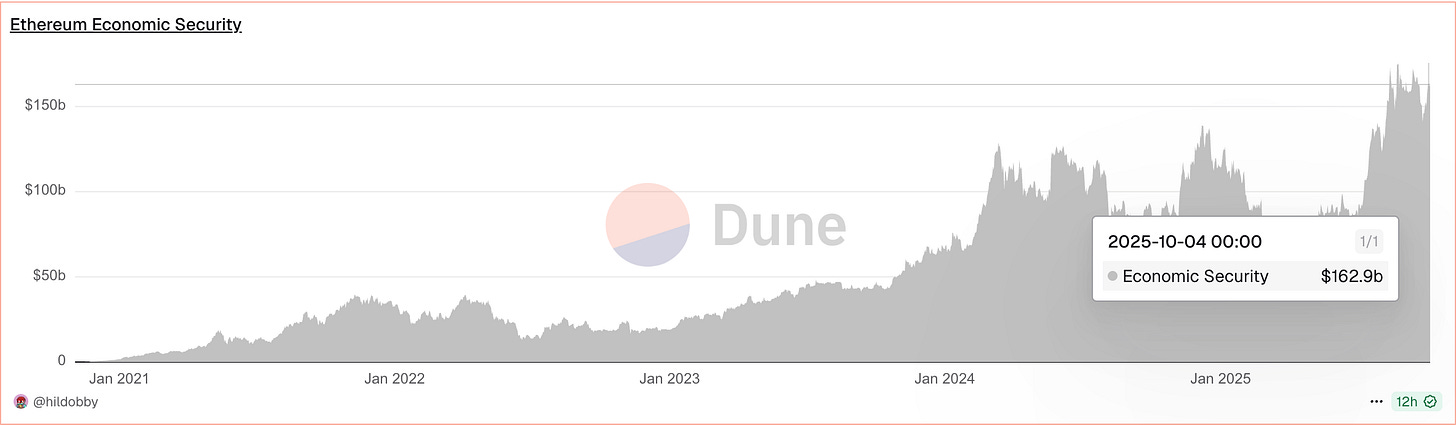 截稿至 10 月 4 日,以太坊的總質押價值為 1,629 億美元,並於過去一個月創下歷史新高;這一數值對比 2022 年底市場最恐慌的時期(約 200 億美元),至少是 8 倍的經濟安全性,各位 Web3 居民可以放心使用💪